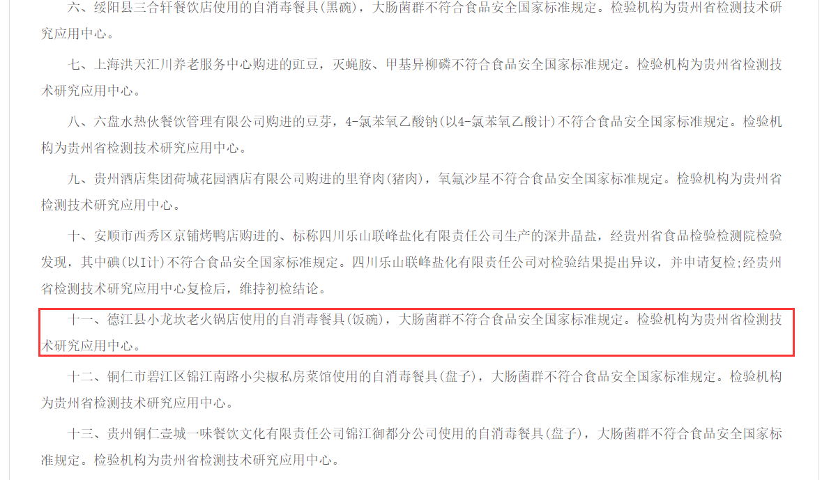 近日,贵州省市场监管局发布了关于29批次食品不合格情况的通告,其中德江县小龙坎老火锅店使用的自消毒餐具(饭碗),被检出大肠菌群不符合食品安全国家标准规定。